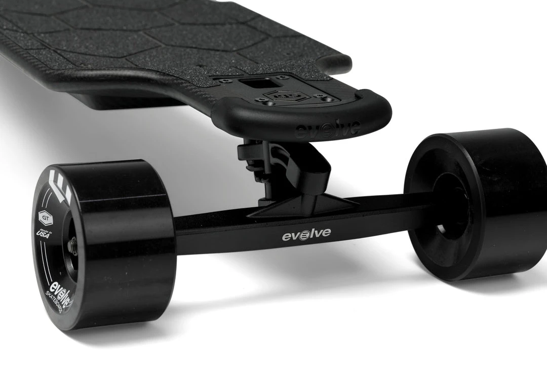 Handmade from 100% Carbon fiber, the Evolve Carbon GTR Street’s deck beautifully conceals the electric system which is powered by our new patent-pending Power Flex battery technology and the best 18650 lithium-ion battery cells available. Providing you with a real-world range of up to 50km per charge, this board will turn any road or path into the endless wave of your dreams. This coupled with Bluetooth communication is a game-changer for Evolve skateboards as it provides instant power and ultra-smooth acceleration and braking performance, placing the ultimate in intuitive riding control in your hands. With 3000 watts of twin brushless sensored motor power driving our new made in USA Evolve GT 97mm inline race formula wheels, this triple matte black beast is like a panther unleashed.