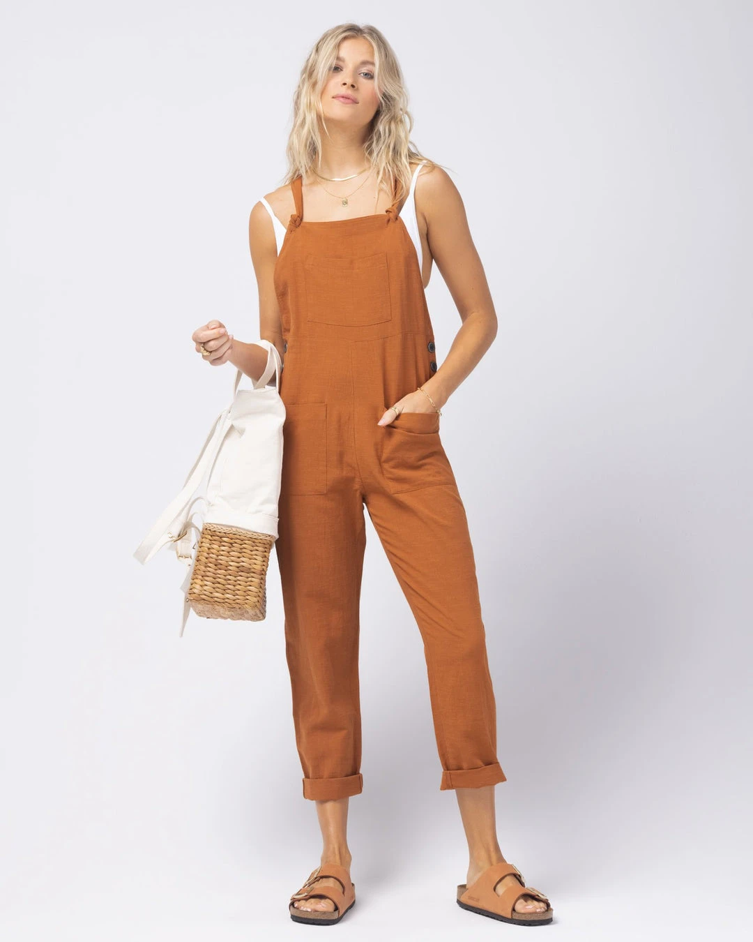 Look chic on the go in the Cali Girl Jumper. This effortless, lightweight jumper features adjustable tie front straps, hip button closures, breezy low-cut sides, and cropped + cuffed legs. Pair with your fave tank or throw on over your ‘kini for the ultimate Cali girl vibe.